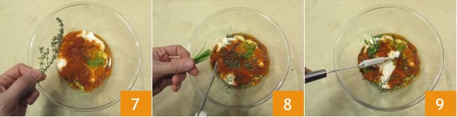Finally, add the fresh thyme leaves 7, chopped chives 8, and oil. Mix well to combine the ingredients 9.