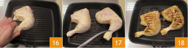 Remove the thighs from the marinade (which you will use later) and place them on a very hot grill 16. Sear them over high heat for a few moments on each side, using tongs to turn them 17 18.
