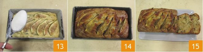 Finally, sprinkle with granulated sugar 13 and bake in a preheated static oven at 350°F for about 60 minutes. Once cooked, remove your fig and walnut loaf cake from the oven 14 and let it cool slightly before removing it from the mold and serving it sliced 15!