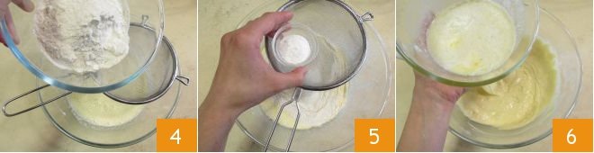 Sift the flour 4 and baking powder 5 into the bowl, then mix with a spatula and also add the melted butter 6.