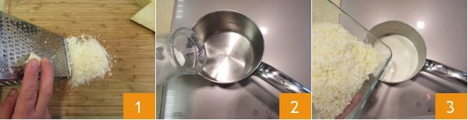 To prepare the figs with pecorino, start with the latter: grate it 1 and set it aside. Pour the cream into a saucepan 2, heat it, then add the grated Pecorino 3, and stir.