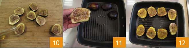 Also season with a drizzle of oil 10. Heat a grill on the stove and when it is hot, place your figs inside 11. Grill the figs for 1 minute, then turn them over 12 and wait another minute.