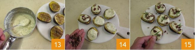 Transfer the figs to a plate, top with a spoonful of fondue 13, and garnish with pieces of pecans 14 and rosemary needles 15.