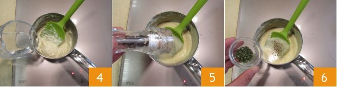 Also add the water 4 and continue stirring until the cheese is completely melted. Season with freshly ground pepper 5 and finely chopped rosemary 6. Turn off the heat and set the fondue aside.