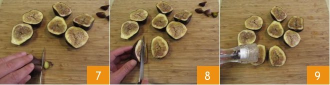Take the figs, wash them well, and dry them. Remove the stem with a knife 7 and cut them in half 8. Season with salt, freshly ground pepper 9.