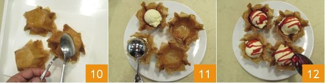 When the basket is evenly golden, remove it from the oil and let it drain upside down on a tray lined with paper towels 10. Proceed in the same way to fry all the baskets. Once cooled, place the baskets on a serving plate, fill them each with a scoop of vanilla ice cream 11, and garnish with the strawberry topping 12: your phyllo pastry baskets with ice cream are ready to be enjoyed!