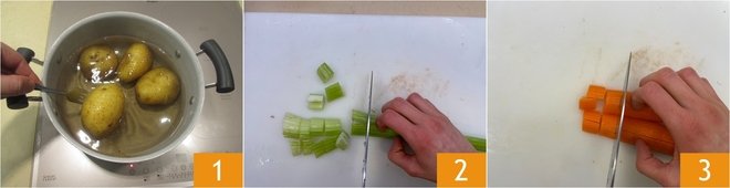 To prepare the fish ravioli with three doughs, first boil the potatoes in boiling water for about 30 minutes after boiling, until they are soft 1. Meanwhile, prepare the vegetables that will cook with the octopus: clean and cut the celery 2 and the carrot 3 into pieces.