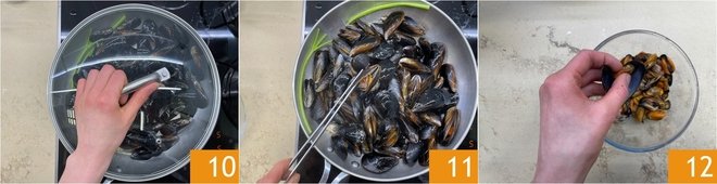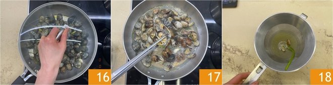 Cover with the lid 16 and cook for about 5 minutes, until they open 17. Shell the clams, strain their cooking water 18, and place them in the refrigerator.