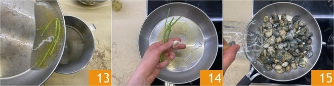 Strain the cooking liquid and set it aside 13. Now cook the clams in the same way: heat the garlic and parsley stems in the pan 14, then add the clams and water 15.
