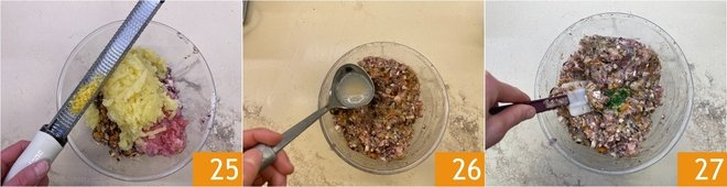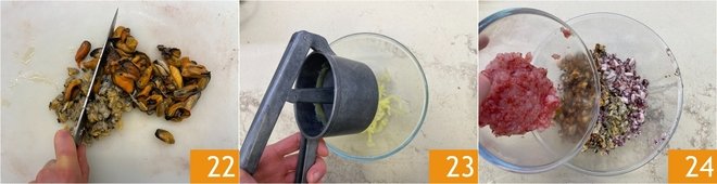 Season with lemon zest 25, a drizzle of oil, and chopped parsley leaves. Mix to combine, then adjust the consistency of the mixture by adding a ladle of the cooking water from the octopus, mussels, and clams 26. Transfer the filling to a piping bag without a nozzle and store it in the refrigerator.