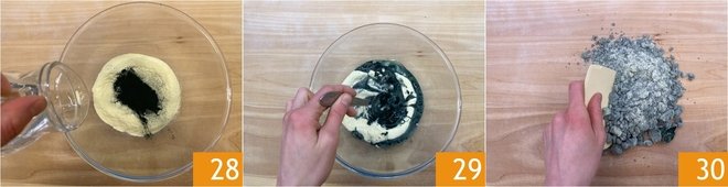Start with the green dough: in a bowl, pour the semolina, spirulina algae, and water 28. Mix first with a spoon to gather all the liquid 29, then knead by hand on the work surface, using a dough scraper 30.