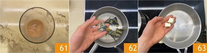 The velouté is ready 61; heat it in a saucepan, bringing it to a boil, just before serving. Now cook the ravioli in salted boiling water 62 and, in the meantime, melt the butter in a large pan 63.