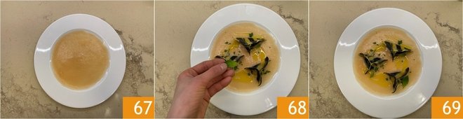 Pour the potato velouté at the base of the plate 67, then place the ravioli and garnish with chopped parsley and basil leaves 68. The fish ravioli with three doughs are ready to be served 69!
