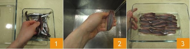 To prepare the fish skewers with Worcestershire sauce, first begin by How to Clean Anchovies. You can use gloves for these operations if you prefer: gently detach the head, and open one anchovy at a time like a book 1; remove the internal spine by running them under cold water 2 and lay them open in a baking dish 3.