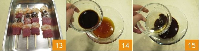 Repeat the same operation for the other skewers and place them in a large baking dish or a pan 13. Move on to the marinade: in a bowl, combine the honey, Worcestershire sauce 14, and white wine 15.