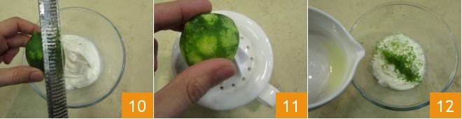 Set the vegetables aside and make the sauce: put the Greek yogurt in a bowl, add the lime zest for fragrance 10, then squeeze half a lime 11 and add the juice to the yogurt 12.