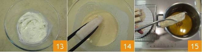 Mix to enhance the flavor and set aside 13. You can now proceed with cooking the fish: heat the seed oil in a saucepan to about 340°F (measured with a kitchen thermometer). Dip one piece of cod at a time into the batter 14 and then into the oil 15. Fry for about 4 minutes or until golden.