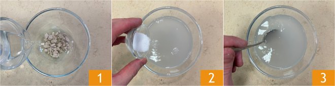 To prepare the five-grain focaccia with figs and lard, start with the dough. In a bowl, crumble the yeast, then add the water 1, sugar 2, and mix to dissolve it 3.