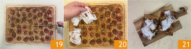 Cut it 19 and garnish each slice with Colonnata lard 20. Your five-grain focaccia with figs and lard is ready to be served 21!