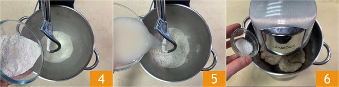 In a stand mixer with a hook (or in another bowl), pour all the flours 4 and the water with yeast 5, then start it until you get a homogeneous dough. Add the salt 6.