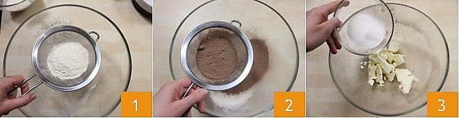 To prepare the flame cupcakes, sift the flour 1 and the Nesquik 2 into a bowl. Meanwhile, place the softened butter and sugar in another bowl 3 and