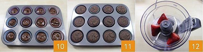 filling them to 3/4 of their height 10. Bake in a preheated static oven at 340°F for 15-20 minutes (or a fan oven at 300°F for 10-15 minutes), checking the doneness with a toothpick. Once baked, let the cupcakes cool and set them aside 11. Place the whole strawberries, washed and trimmed, in a blender 12 and blend until