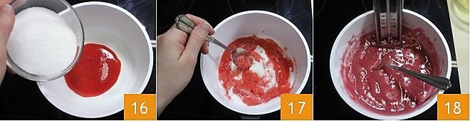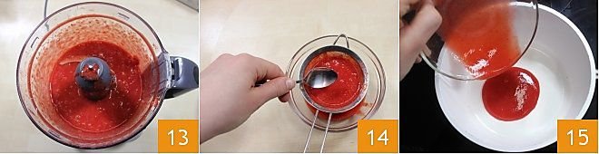 a puree is obtained 13. Pass the puree through a fine mesh sieve to remove any lumps and seeds: you should obtain 1.41 oz (40 g) of juice in total 14. Pour the strawberry juice into a small saucepan 15 and