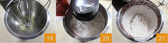 Meanwhile, beat the egg whites with a hand mixer or a stand mixer whisk at medium speed until stiff peaks form 19. When the syrup reaches the indicated temperature (250°F), pour it in a thin stream over the egg whites 20, continuing to beat not only until the syrup is finished but also until the meringue is completely cooled. The strawberry meringue should be very thick, smooth, and shiny 21.