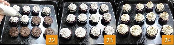 Transfer the strawberry meringue to a piping bag with a star nozzle and pipe a generous swirl onto each cupcake 22. Place the cupcakes on a baking tray 23 and bake them in a static oven at 480°F for 2-3 minutes until the meringue begins to color 24. Your flame cupcakes are ready!