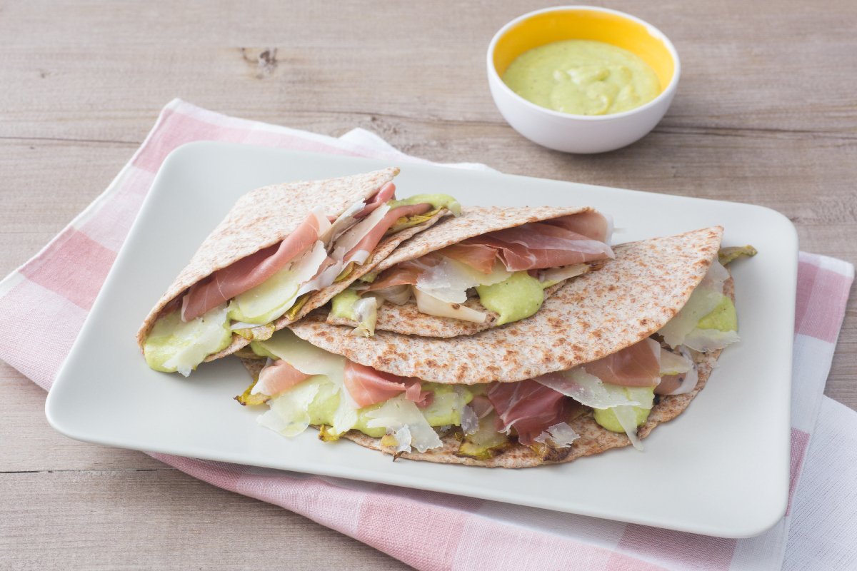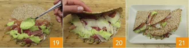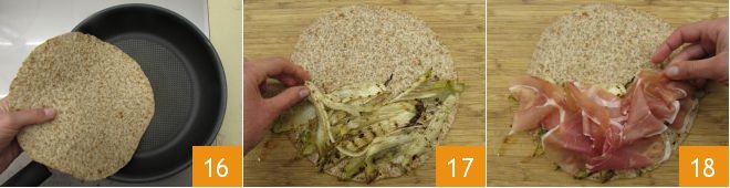Heat the flatbreads for a couple of minutes and fill each flatbread with half of the filling ingredients: first place the grilled endive 17, then the slices of prosciutto 18.