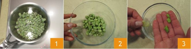 To make the flatbread with prosciutto, fava bean pesto, and endive, first prepare the fava bean pesto: bring water to a boil in a small pot and then cook the shelled fava beans for 5 minutes 2. Drain them into a bowl 2 and remove the skin 3.