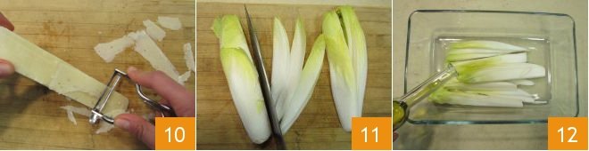 Slice the pecorino into flakes and set aside. Wash and cut the endive into wedges about 0.4 inches 11. Transfer the endive to a bowl, season with oil 12.