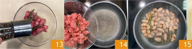 Lightly salt, pepper 13, and mix well. Heat a non-stick pan thoroughly, then add the sausage 14 and brown for about 5 minutes, then set aside 15.