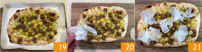 Bake at 482°F in a fan-assisted mode for 5 minutes 19, then finish with raspadura cheese 20. Your flatbread with sausage and potatoes is ready to be enjoyed 21!