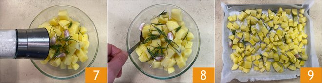 Place the potato cubes in a bowl, then season with the unpeeled garlic cloves 4, rosemary needles 5, and oil 6.