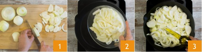 To make the flatbread with Taleggio and caramelized onions, first clean the onions, then slice them to a thickness of about 1/8 inch 1. In a pan, heat the onions 2 with a drizzle of oil 3.