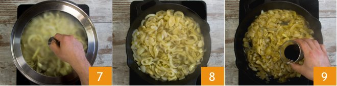 Stir, cover with a lid 8, and cook for about 20 minutes on low heat, stirring occasionally. After this time, uncover 8 and continue cooking for another 45 minutes on low heat, stirring frequently. When the onions are nicely softened, pour in the balsamic vinegar 9, let it evaporate, and then turn off the heat.