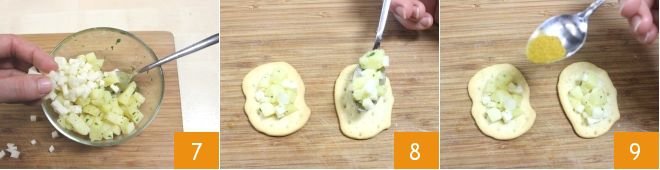 Add the Asiago cubes to the potatoes 7 and then arrange the crispy flatbreads on a surface. Dress them by spooning the Asiago potato salad on top 8 and finish with a sprinkle of curry 9. Your flatbreads with Asiago potato salad are ready to be served!