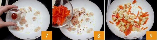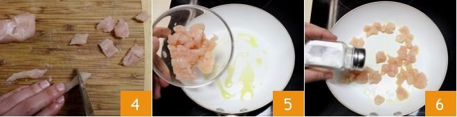 Then cut the pieces into small chunks just over half an inch 4. In a pan, heat a little oil and add the chicken pieces 5. Brown them for a moment, stirring to sear on all sides. Then salt to taste.