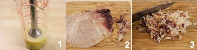 To prepare the flatbreads, start with the citronette: squeeze the lemon and pour it into a tall and narrow container, add the oil, salt, and pepper and use an immersion blender to blend the sauce to obtain your citronette. Then take care of the fish: place the slices of smoked swordfish on a cutting board and cut it with a knife to obtain a tartare.