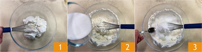 To prepare the flourless ricotta and cocoa cake, first beat the ricotta with a whisk 1. In the same bowl add the sugar 2 and vanilla extract 3.