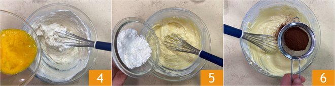 Also add the eggs 4, the cornstarch 5 and the sifted cocoa 6. Mix well to avoid lumps.