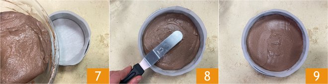 Transfer the mixture into an 8-inch pan, previously buttered and lined with parchment paper 7. Smooth the surface carefully 8 and bake in a convection oven at 338°F for about 60 minutes 9.