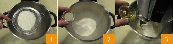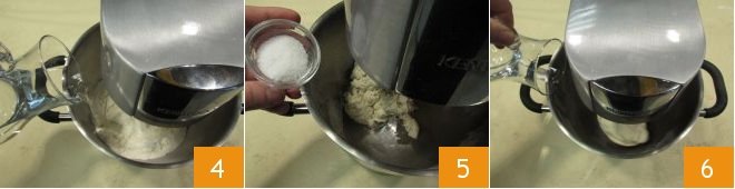 At this point, add about 3/4 of the water, pouring it in slowly 4. Once the mixture has come together, add the salt 5 and also add the remaining water slowly 6.