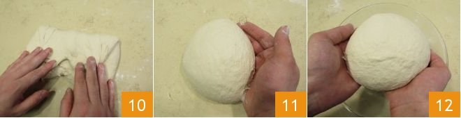 Proceed by folding the dough, taking the ends and folding them inward 10. Then form a ball 11 and place it in a previously oiled bowl 12. Let it rise for a couple of hours, covering the bowl with plastic wrap.