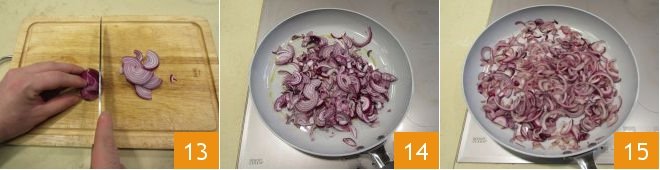 In the meantime, slice the onions 13 and sauté them with a drizzle of oil 14 for about ten minutes, seasoning with salt and pepper 15.