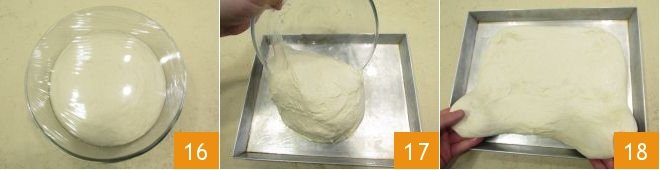 After the two hours of rising, the dough will have doubled in size 16. At this point, oil a 14x11 inch baking pan and pour in the dough 17; proceed by spreading it very gently with your hands 18.