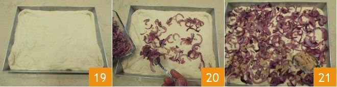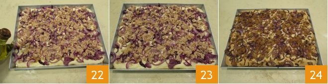 Once the entire surface of the pan is covered 19, sprinkle the focaccia with the freshly sautéed onions 20 and finally add the tuna 21.