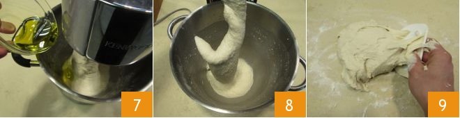 When the dough has absorbed all the water, add the oil in a thin stream little by little (as with the water) to allow the dough to gradually absorb it, thus promoting gluten development 7. Work the mixture in the mixer for about 15 minutes 8, then transfer it to a floured surface 9.