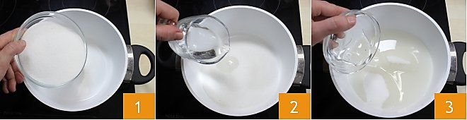 To prepare fondant sugar, start by putting a saucepan on the stove and melting the granulated sugar 1 together with the water 2 and glucose 3.